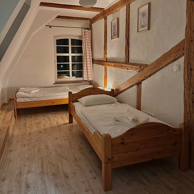 Obszerny pokój z dwoma pojedynczymi łóżkami oraz przedsionkiem. W jego wyposażeniu jest telewizor, czajnik i lodówka. Pokój posiada zupełnie osobne wejście od podwórza.